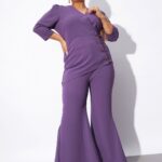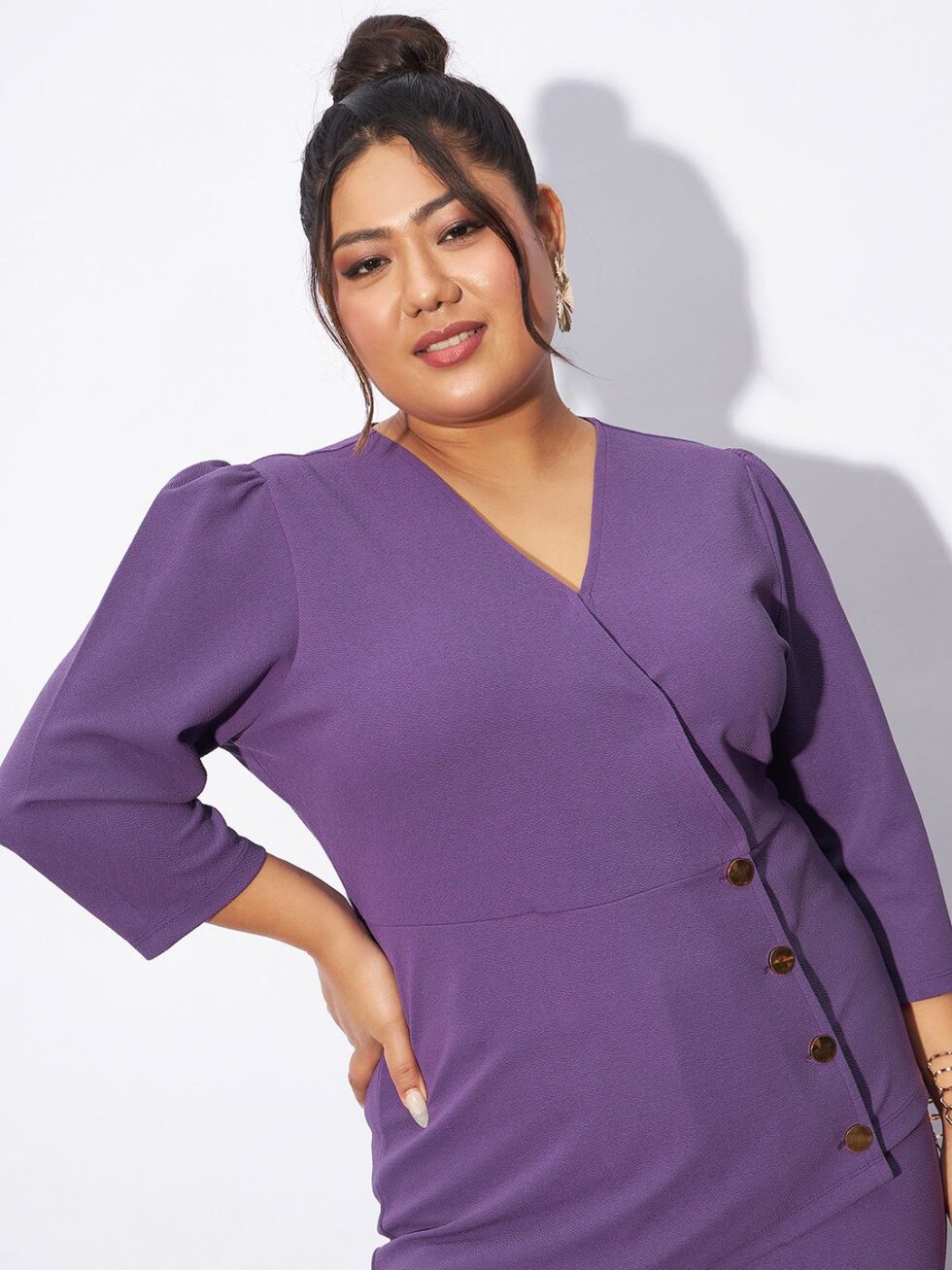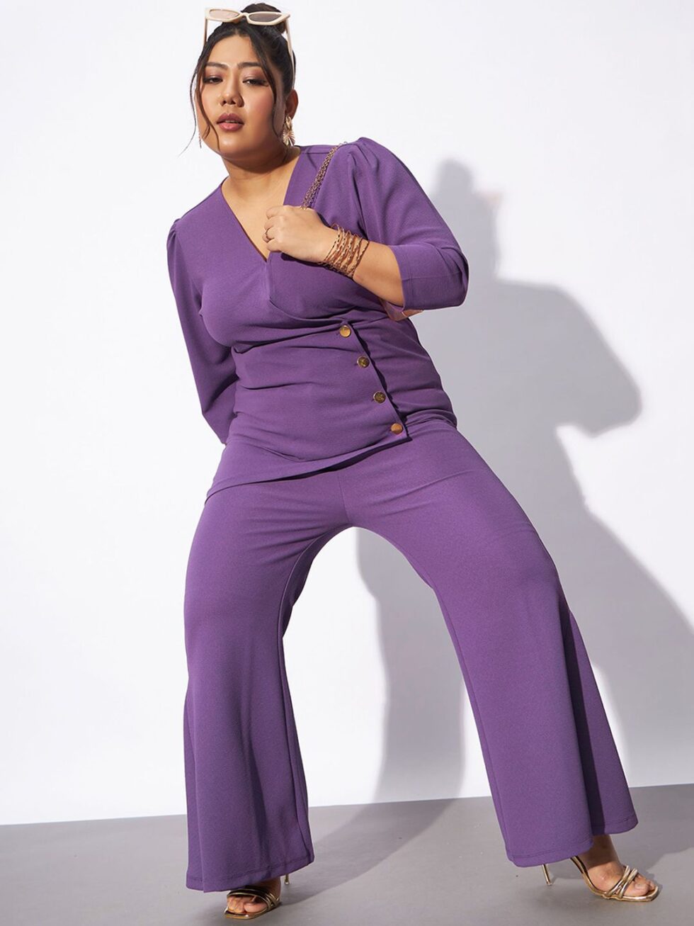 This co-ords consists of top and Trousers Lavender coloured solid top, has V-neck, three quarter sleeves, full placket button closure and asymmetric waist hem Lavender coloured solid mid-rise trousers, has a button closure and flared hem