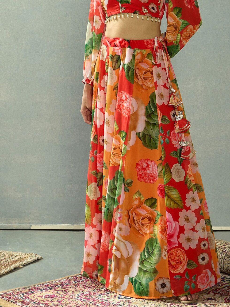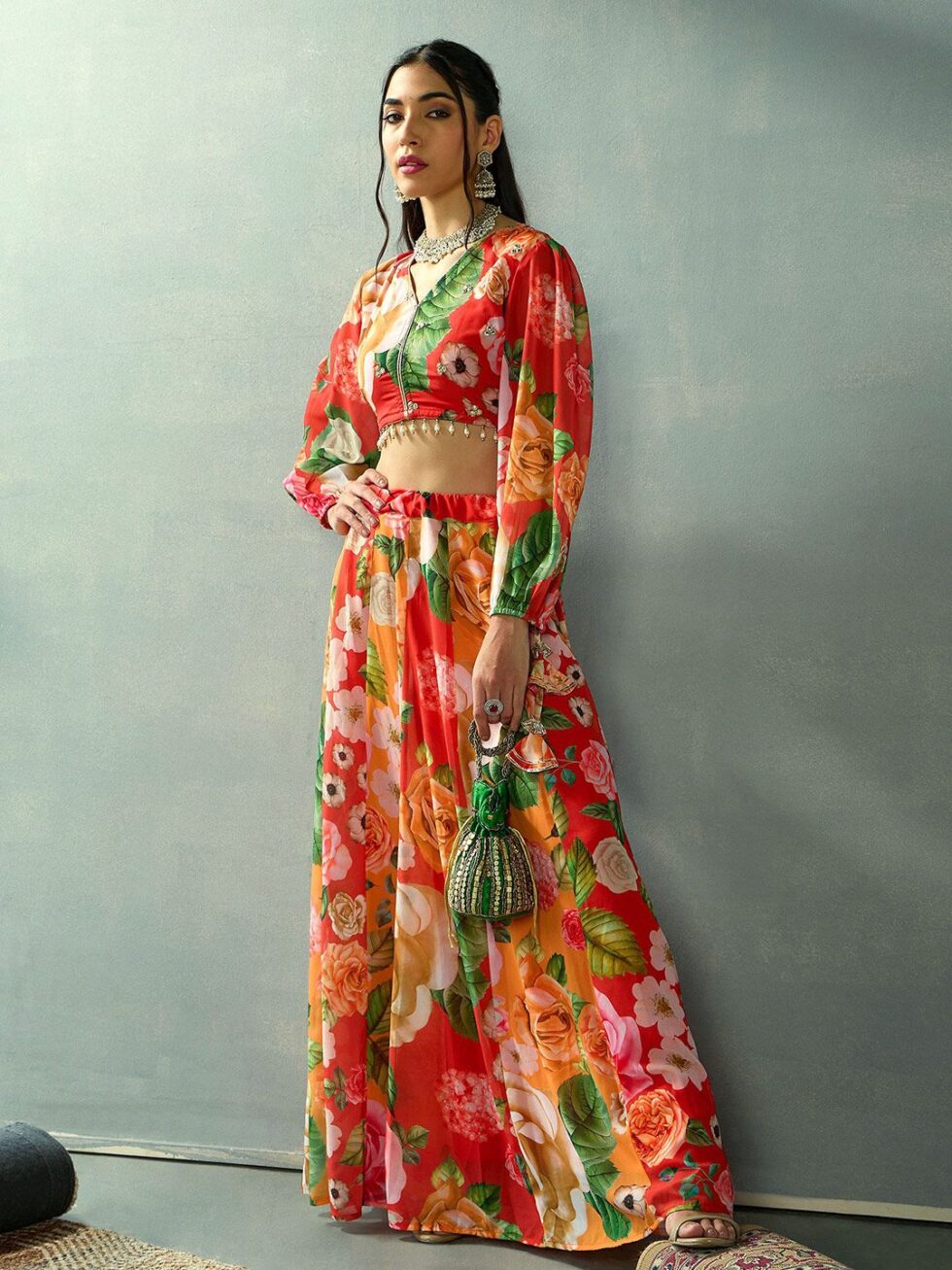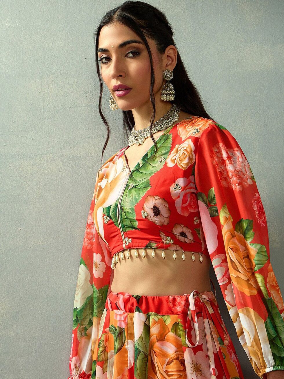 Red and green printed ready to wear blouse, has a v-neck, long sleeves, red and green printed ready to wear lehenga, has slip-on closure, flared hem