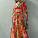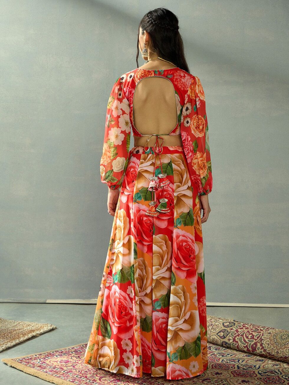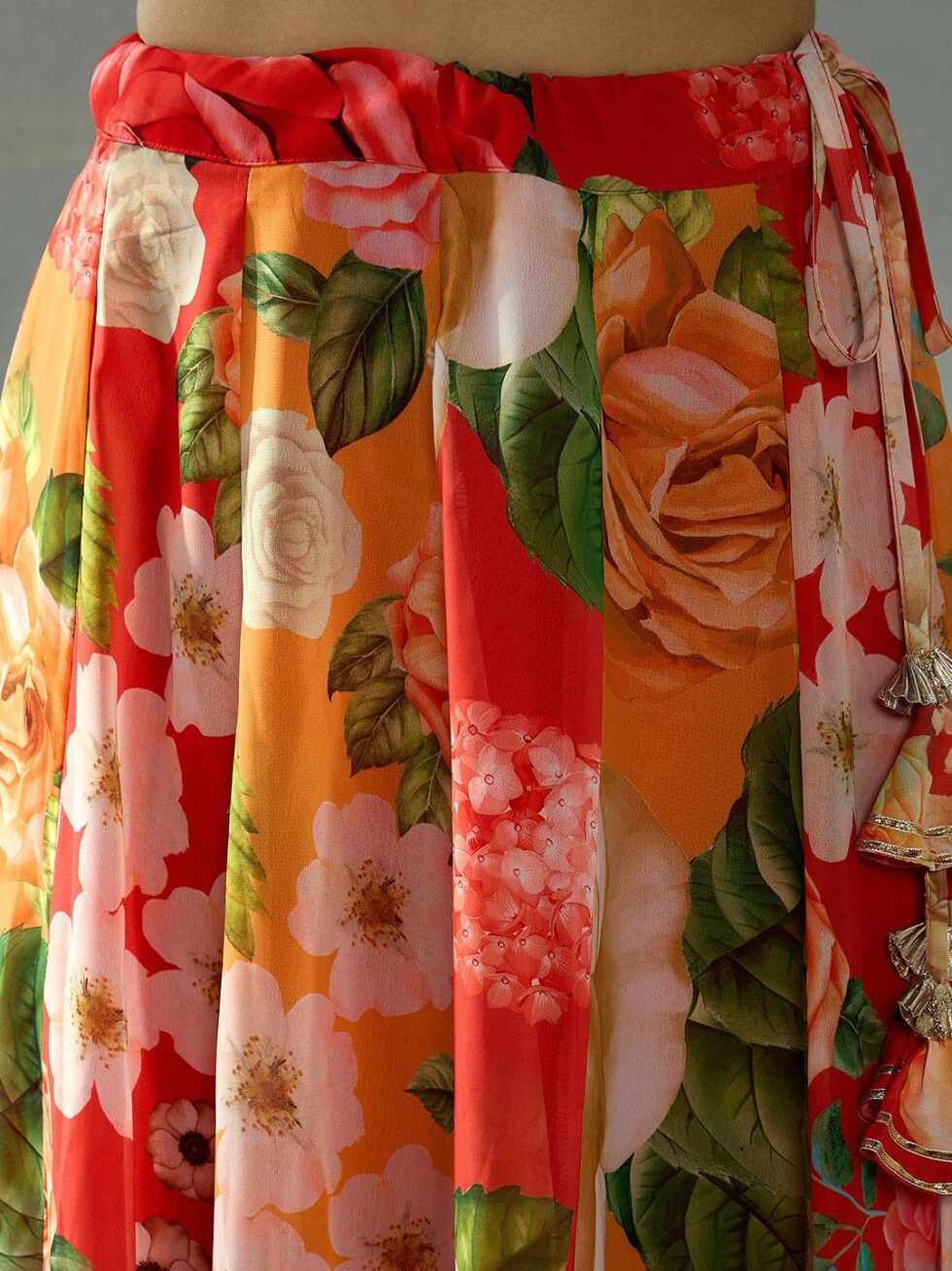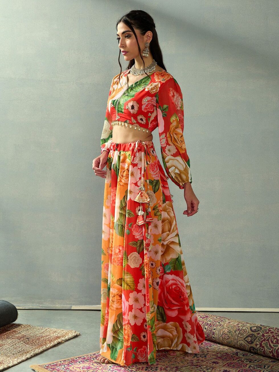 Red and green printed ready to wear blouse, has a v-neck, long sleeves, red and green printed ready to wear lehenga, has slip-on closure, flared hem