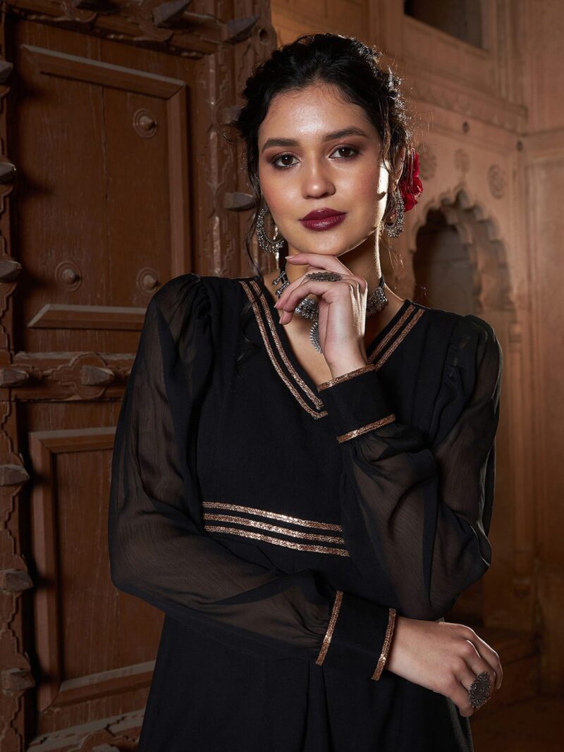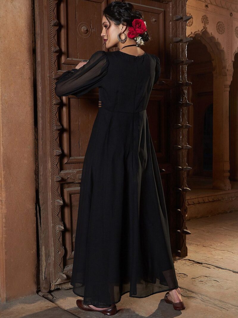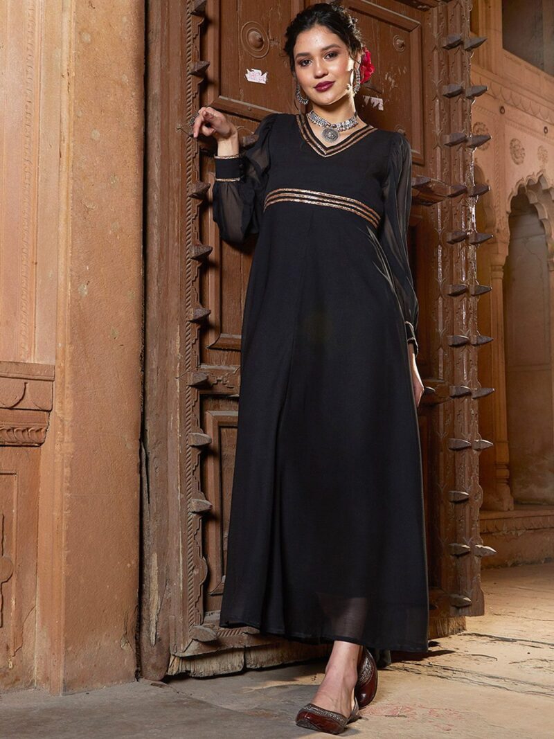Black & gold solid maxi flared ethnic dress, has a v-neck, three-quarter bishop sleeves, and flared hem