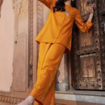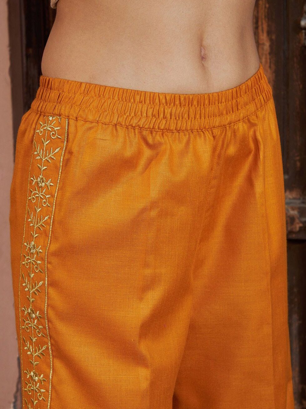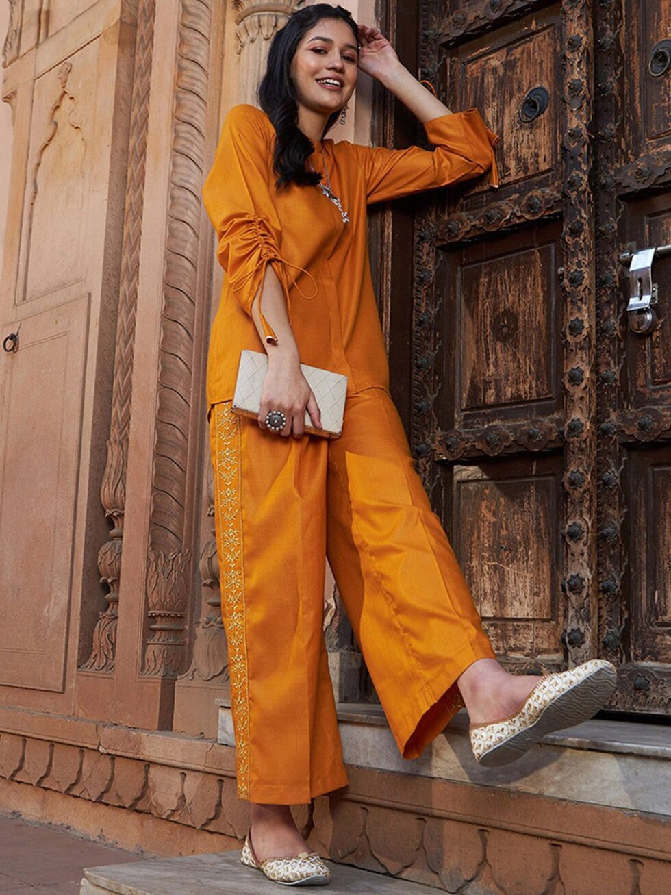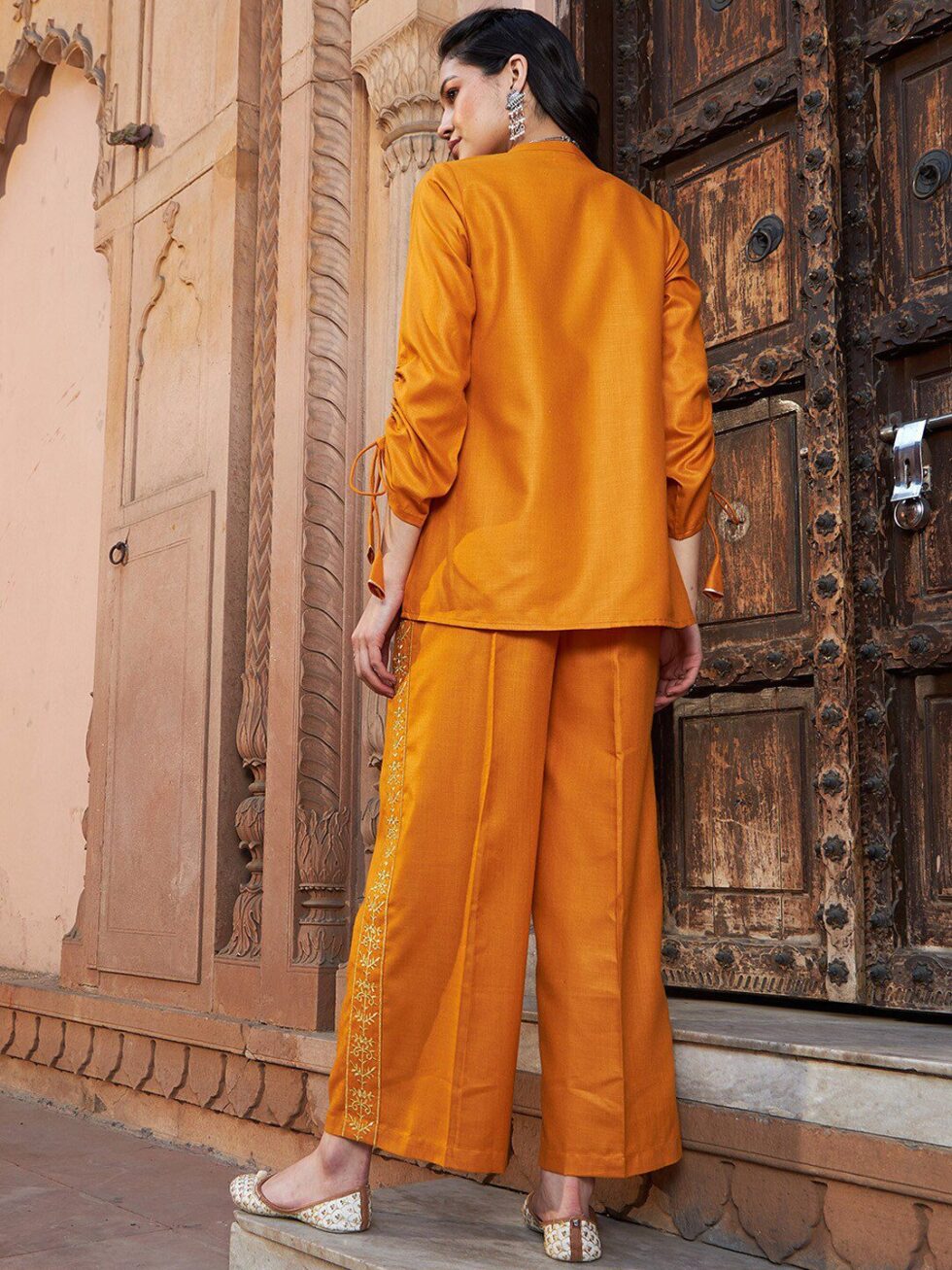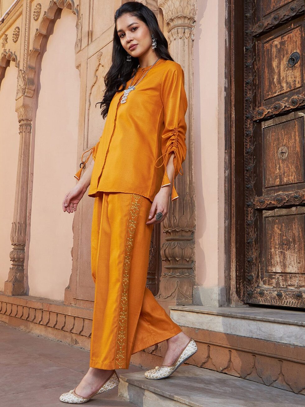 This co-ords consists of top and trousers Mustard yellow solid top, has mandarin collar, Three-Quarter ruched Sleeves, full placket button closure Mustard yellow embroidered mid-rise trousers, has elasticated waistband with slip-on closure