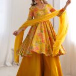 Add a touch of elegance and sophistication to your festive wardrobe with this stunning yellow floral printed silk designer palazzo suit.