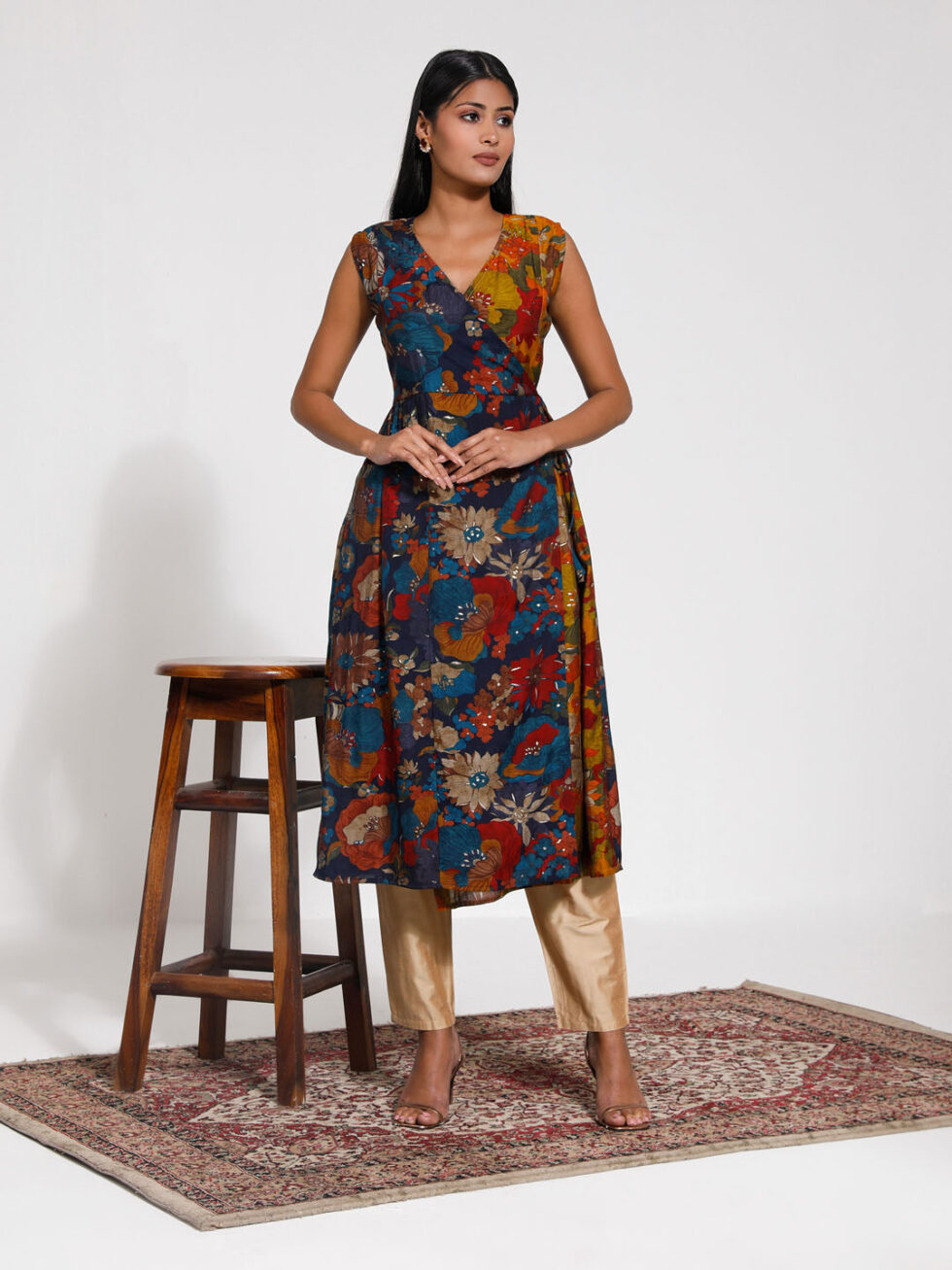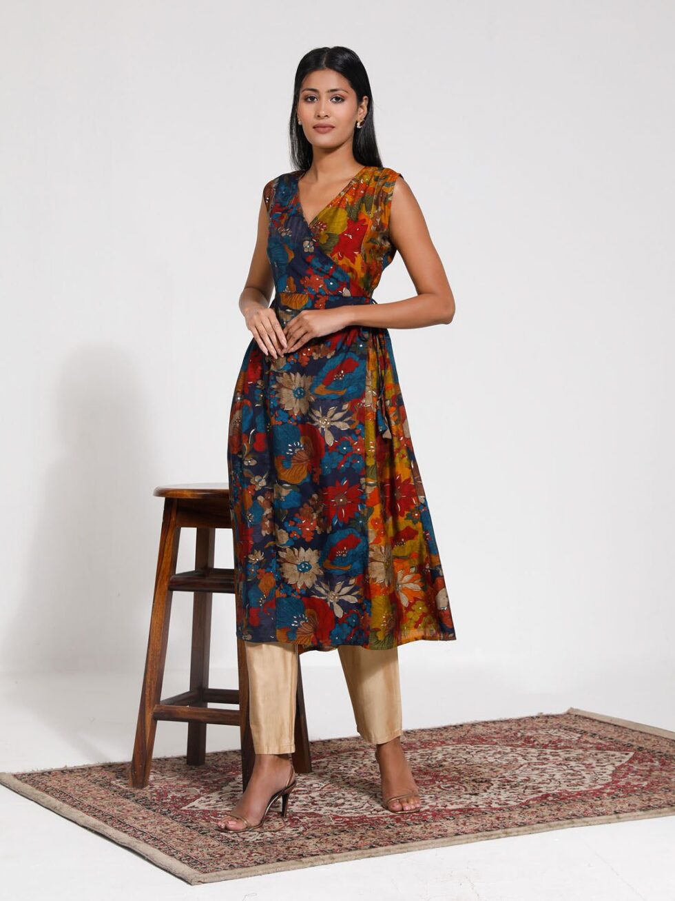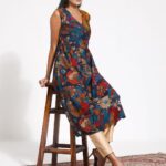 Specifications Sleeve Length – Sleeveless Top Shape – A-Line Top Type – Kurta Top Pattern – Printed Top Hemline – Flared Top Length – Calf Length Neck – V-neck Print or Pattern Type – Printed