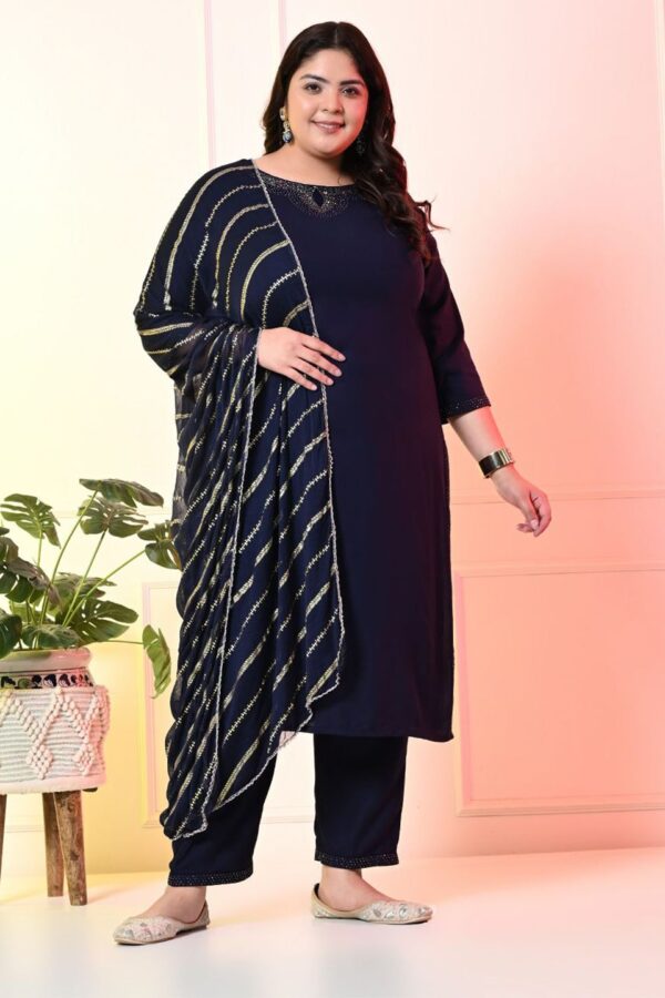PrettyPlus by Desinoor.com Plus Size Geometric Yoke Design Kurta With Trousers & Dupatta