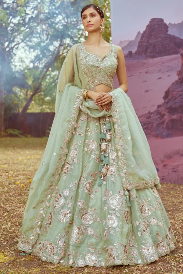 Original price was: £176.35.£121.89Current price is: £121.89.Limegreen – Golden-Silver Sequined Floral Design Embroidered Organza Semi-Stitched Lehenga choli