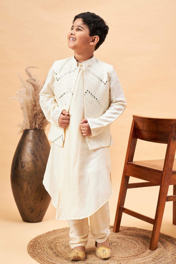 Boy’s Cream Mirror Work Jacket And Pleated Kurta Pyjama Set