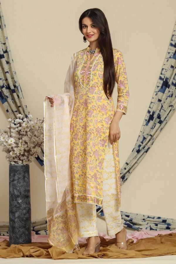 Yellow Hand Block Print Cotton Suit Set with Kota Doria Dupatta