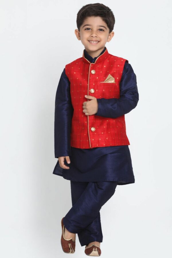 Boys Maroon Silk Blend Nehru Jacket With Navy Blue Kurta And Pyjama Set