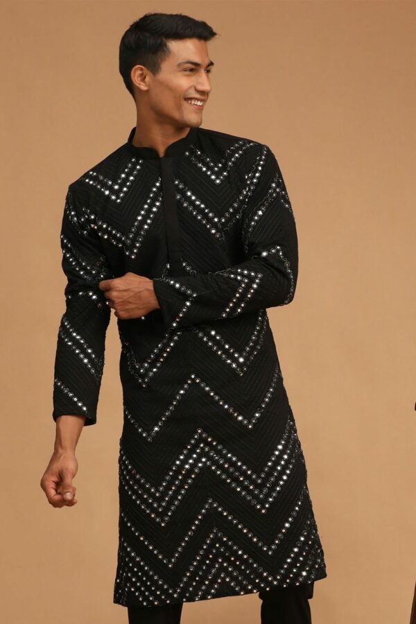 Men’s Black Embroidered Vertical Mirror Work Kurta