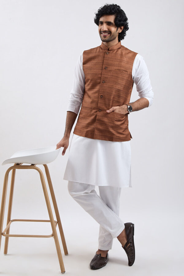 Vastramay Men’s Coffee Brown And White Cotton Blend Jacket, Kurta and Pyjama Set