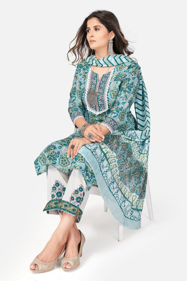 Vbuyz Women Turquoise Blue Ethnic Motifs Printed Layered Pure Cotton Kurta with Trousers